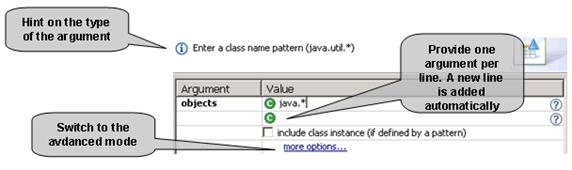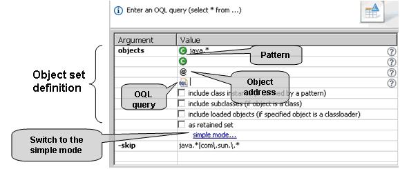 In advanced mode, you can define a set of objects with a pattern, object addresses or an Object Query Language (OQL) query. Icons and help messages give you information about the type of the argument.