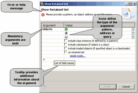 Mandatory arguments are in boldface. Tooltips and help infopop that are below the dialog provide argument description. The message area of the dialog itself shows information about the selected argument or an error message if you have entered a not valid value. Some queries require a set of objects as an argument. You can provide those objects using the simple or the advanced mode of the dialog. On the figure below you can see the simple mode. A set of objects is defined by a pattern.