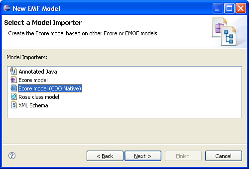 On the next page, the Select a Model Importer page, select the Ecore model (CDO native) importer: